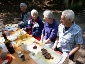 Nach rund 1 3/4 Stunden wandern erreichten wir die Waldhütte der Bürgergemeinde Münchenstein, wo die Kurzwanderer sich bereits eingerichtet hatten. Mit Klappgarnituren wurde an der Sonne Platz gemacht für knapp 20 Leute, die rasch die mitgenommenen Getränke auftischten und sich den Apéritif schmecken liessen. Am Grill machten sich die ersten daran, ihr Fleisch und Würste zu grillieren.